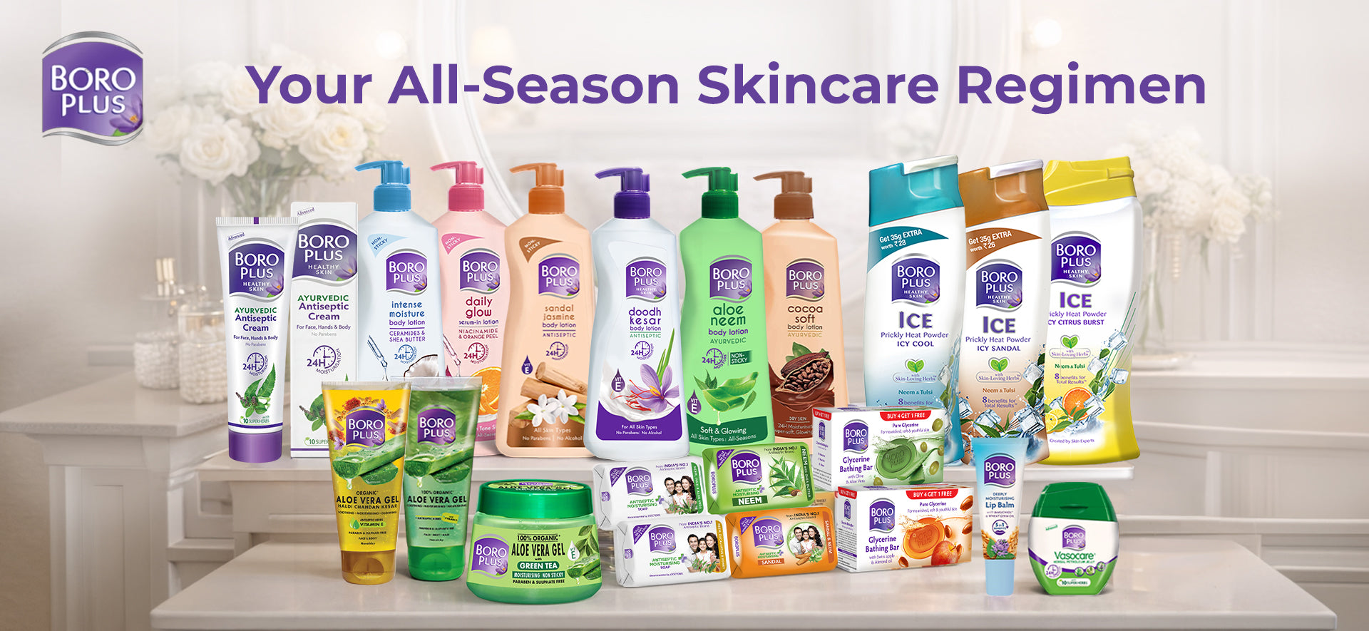 BoroPlus distills the wisdom of Ayurveda and natural ingredients to create gentle yet effective skincare. From the iconic antiseptic cream to moisturising lotions, aloe vera gels, powders, and soaps, every product nourishes, heals, and protects — earning the trust of generations.